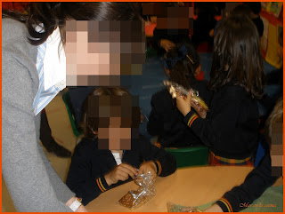 se lo pasaron fenomenal, preguntándome... ¿así Mar? ¿así Mar? cuando tenían que hacer los mofletes y la nariz, y cuando pintaron las cejas, una niña me preguntó ¿Mar, no será rotulador permanente? jajaja, se lo pasaron en grande, nada mas terminarla muchos ya se la querían comer, pero conseguí que la metieran en una bolsita y la ataran, para que la vieran sus papas. Menos mal, que llevé unas galletitas con las iniciales de los nombres de los niños y de las profes, que hizo Alejandra, tuve que engañarla diciéndola que era un encargo para una señora, porque ella decía que si era para su cole.
